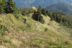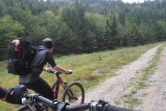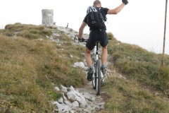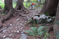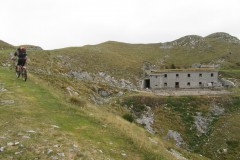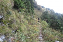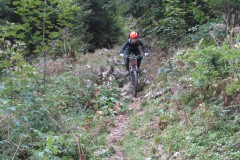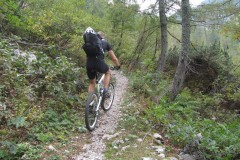 Spust je bil prijeten in v celoti vozen razen od koče do sedla (5 min) kjer je bilo potrebno par krat sestopiti za kak meter, pa še to bi kdo z več znanja lahko prevozil. Pot se nadaljuje po serpentinah kjer je potrebno uporabljati ti. front pivot. Spust je bil čudovit in tudi sonce se je pokazalo ravno, ko sva začela s spustom. Vso pot navzgor naju je spremljala nekakšna oblačnost, vsaj vroče ni bilo. Čeprav nisem ravno navdušen nad turami z preveč nošnje je bila ta prav uživaška.