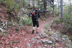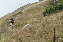 Prvih 1000 višinskih metrov je bilo po lepi mulatjeri, ki ni bila prestrma in se je na prečki počasi zožila v lepo enoslednico. proti Slatniku, nato je sledilo malo spusta in potem vzpon proti Kobli in spet spust in na koncu tega spusta se je začelo nošenje kolesa. Sicer sem kar vztrajal in se zaganjal v dokaj neprevozne dele in črpal preostalo energijo. Priznam, kar nekajkrat sem izgubil bitko s potjo in moral sestopiti s kolesa, kar je razlog da se ne večina odloči za nošenje cel ta odsek. Po melišču se je dalo še nekaj odpeljat potem pa se je kolo preselilo na hrbet in v glavnem do koče ostalo na hrbtu. Izjema so bili kratki odseki kjer sva peljala samo za poziranje kameri. Verjetno ni potrebno posebej poudarjati, da se je počitek in okrepčilo v kolči zelo prileglo.