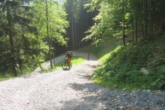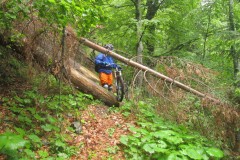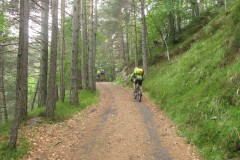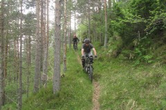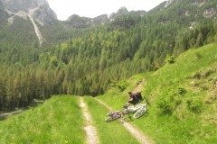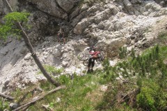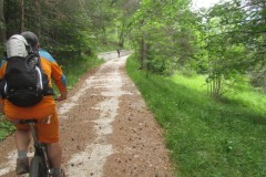 Takoj, ko smo zapeljali na drugo stran avtoceste se je pred nami začel precej strm makadam. Ta ni želel popustiti. Vzpon je bil ves čas težavnosti V5-V7, edini čas za počitek so bili ovinki kjer je vsaj malo popustila strmina. V5 je bila bolj izjema kot pravilo. Tako se je nadaljevalo celih 800 višinskih metrov. Zelo strm, na delih slabo utrjen makadam nam je kar pobiral moči. Po krajšem postanku in okrepčilu se je začela veliko prijetnejša pot. Žal ni trajala dolgo, kmalu se je začelo nošenje kolesa do sedla. Tam je padla odločitev, da se spustimo po eni najlepših enoslednic v dolino Dunje na drugo stran. Sliši se samoumevno a ne? Težava je bila, ker je to za sabo potegnilo ponoven vzpon za 600 višincev po strmem betonu in asfaltu. Kot se je izkazalo ni bilo tako naporno kot se je slišalo. Težavnost je bila V4 kasneje slab V5. Proti koncu se je tudi mati narava malenkost zarotila proti nam. Malo pred koncem drugega vzpona je začelo deževati in pihati. Pot do avta smo odpeljali po strmi makadamski cesti namesto, da bi iskali nemarkirano pot, ki bi naj peljala nekje blizu. Hrana je v glavnem pošla, bili smo mokri, po 1800 višincih tudi malo utrujeni, vreme ni kazalo na izboljšanje pot bi bila v »neznano«. Kljub želji po avanturi je prevladala razsodnost in razum. Tudi po tej makadamski cesti je bilo zabavno smo pač malo spustili zavore…Kljub težkemu vzponu in nošnji sem zelo vesel, da smo jo odpeljali, predvsem, ker sem premagal dolg težek vzpon. Ponavljanje, danes še ne, čez dva tedna, hmm …