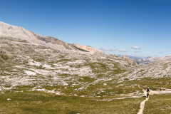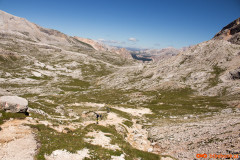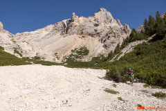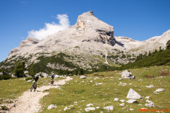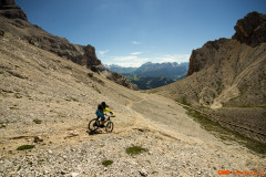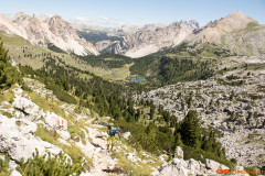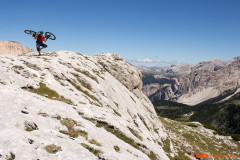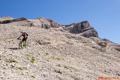 Nedelja zjutraj, cilji postavljeni še nekoliko višje kot včerajšnji. Dobesedno višje. Napadamo prvega tritisočaka imenovanega Lavarella. Iz kampa proti istemu izhodišču kot včeraj. Že po nekaj metrih srečamo staro znanko včerajšnjega spusta, pot številka 11. Sledi nekaj metrov grizenja po strmi peščeni podlagi dokler nas noge ne opozorijo, da naj to presneto kolo že dvignemo na ramena. Slabih štiristo višincev nošnje je minilo kot bi trenil, dobrih petinštirideset minut in bili smo na vrhu. Sledila je zmerno položna in v celoti vozna pot mimo jezera Limosee (Lago del Limo) do koče Lavarella. Od tu naprej nas je prvič do sedaj Tabacco (Znamka zemljevida) pošteno razočaral. Pot številka dvanajst je označena s polno črto, kar praviloma pomeni vozno pot. Tokrat je bila tako označena pot precej nosaška, sicer dokaj široka pešpot z veliko ruševja, stopnicami, luknjami in podobnim. Za moj okus ne bi bila vozna niti v obratni smeri. Preden se je pot začela spuščati smo se ustavili in skočili kak meter višje na ogromen plato iz katerega je bil čudovit razgled na vse strani. Okrog nas obroč gorovja mi pa v sredini na visokem platoju, ki je ponujal čudovito panoramo in pogled nazaj v dolino proti koči Lavarella. Proti sedlu nadaljujemo po zanimivi poti, polni lukenj in zarez. Na srečo je bila ta precej bolj vozna kot tista do omenjene razgledne točke. Od sedla do vrha je bilo višinske razlike še dodatnih petsto višincev nošnje. Pogled proti vrhu je nam ni razkril poti in tudi nošnja je nekaterim že malo presedala. Povzpnemo se še nekoliko višje kolega se ustavita in usedeta, odločitev, da bo vrh ostal neosvojen je bila bolj ali manj enotna. Jaz in drug sotrpin nadaljujeva še nekaj metrov, tretji par je šel v izvidnico še nekoliko višje. Bili smo posejani dva po dva na vsakih nekaj višincev, pojedli vsak svoj zalogaj hrane in kljub že znani odločitvi počakali na rezultate izvidnice. Najbolj vztrajna dva sta potrdila, da je bi bila nošnja na vrh nesmiselna in verjetno tudi nevarna zato smo se sprijaznili z usodo in se veselili užitka spusta.
